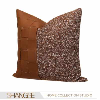新品尚塞布艺现代北欧新中式极简沙发样板房褐色皮革编织拼接抱枕热门设计联盟服务商