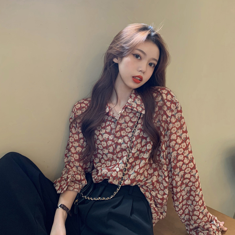 2021春款女装长袖雪纺衬衫女夏季薄款复古港味设计感小众碎花上衣热门设计联盟服务商