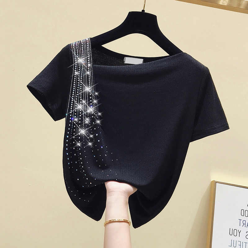 冰丝t恤女短袖2021夏新款洋气显瘦设计感小众烫钻不规则黑色上衣热门设计联盟服务商