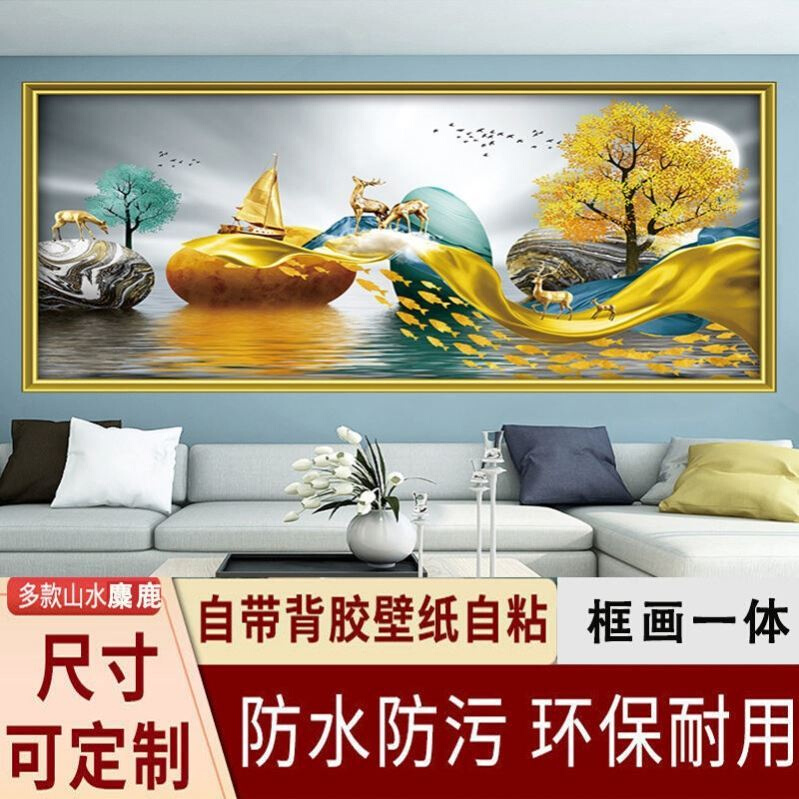 挂在客厅墙上的装饰画自粘3D立体自粘墙贴画山水麋鹿客厅沙发电视热门设计联盟服务商