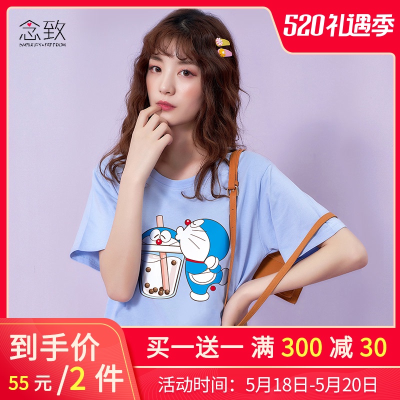 蓝胖子圆领卡通印花纯棉短袖T恤女雾蓝色显白韩版修身学生风上衣热门设计联盟服务商